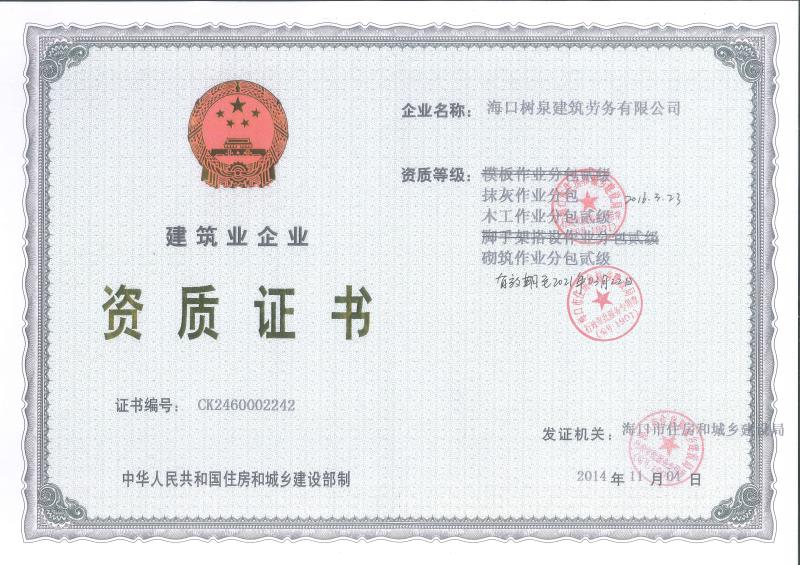 海口樹(shù)泉建筑勞務(wù)有限公司成立于2011年,公司位于海口,其前身是一家專業(yè)建筑施工隊(duì),自2004年即開(kāi)始在海南從事建筑勞務(wù)施工。自成立至今,公司已經(jīng)擁有一支科學(xué)管理、質(zhì)量過(guò)硬、能打硬仗,搶工期的專業(yè)隊(duì)伍。能獨(dú)立承擔(dān)大中型工業(yè)與民用建筑 、室內(nèi)外裝修、各類(lèi)機(jī)電設(shè)備安裝工程。代表工程有海口濱海華庭、三亞時(shí)代海岸T01/02/04/05棟高層、合肥東海花園二期、陵水富力灣B區(qū)高層、三亞金中海(酒店)、瓊海大印經(jīng)典花園、海口環(huán)球海景大酒店(四星級(jí)酒店,在建中)、陵水珍珠大廈(五星酒店)、海口萬(wàn)達(dá)廣場(chǎng)、美蘭機(jī)場(chǎng)二期。